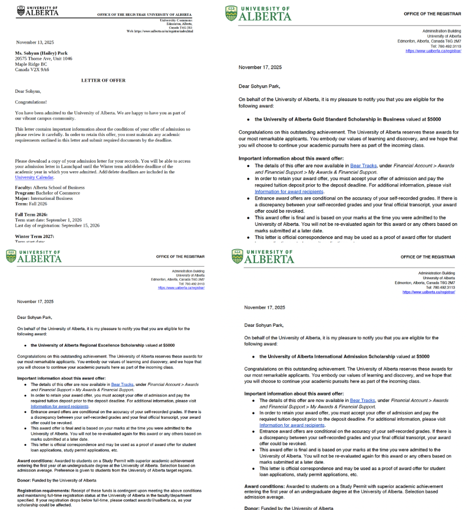 YSI Academy의 12학년 Sohyun Park 학생이 캐나다 명문대학 University of Alberta(알버타대학교)로부터 $15,000 장학금과 함께 합격 소식을 전해왔습니다!