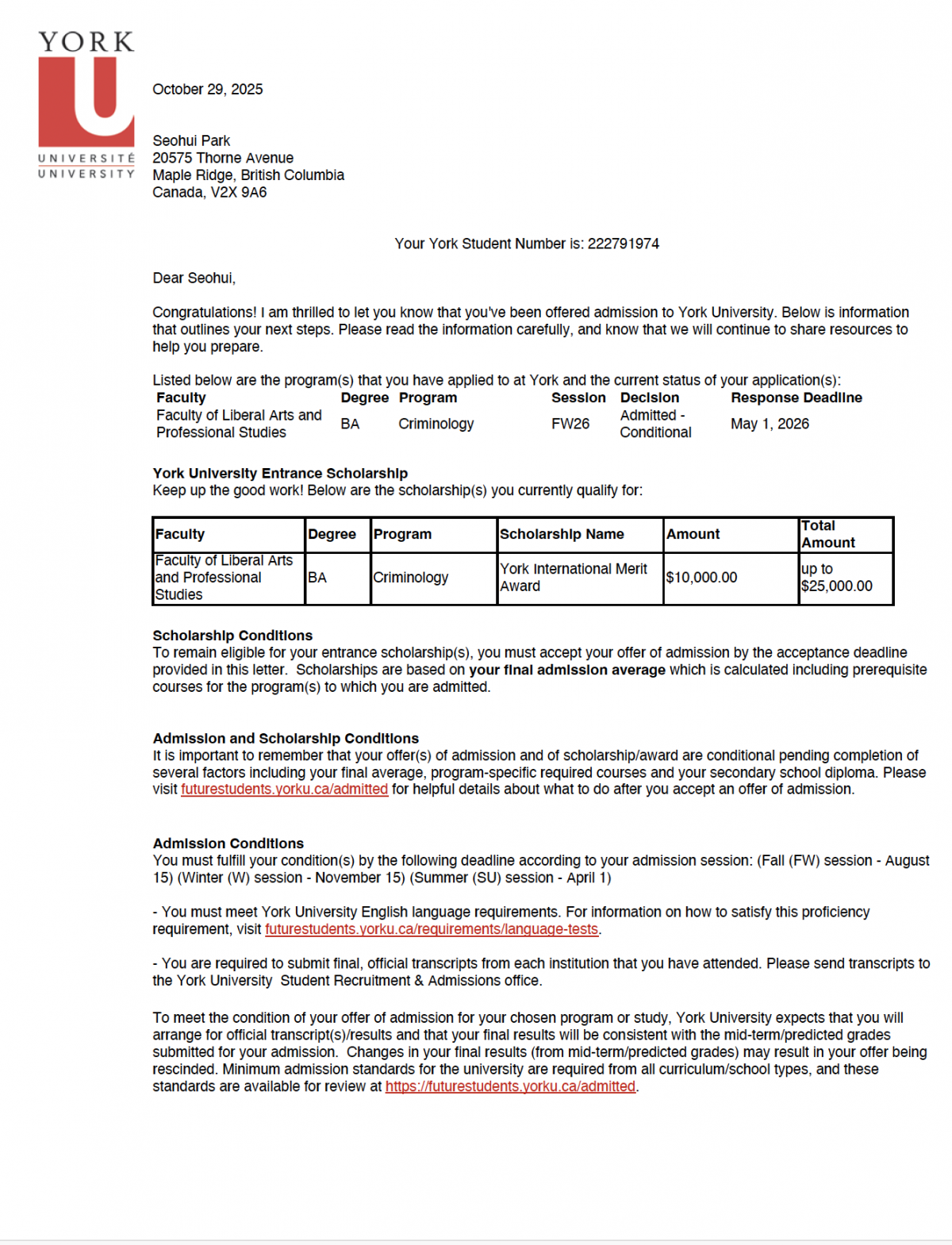 University of Alberta 장학금 오퍼와 합격에 이어, 이번에는York University Criminology학과로부터 무려 $25,000 장학금 오퍼와 함께 합격 소식을 전해왔습니다!