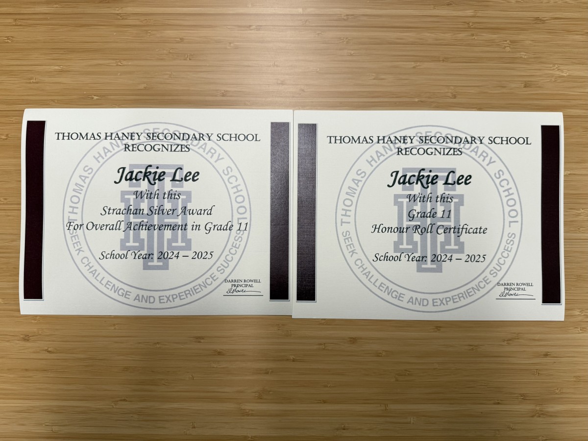 Thomas Haney Secondary School에 재학 중인 YSI Academy의 Jackie Lee 학생이 7개 과목에서 상위 10% 이내의 학생에게만 주어지는 Strachan Silver Award Overall Achievement를 수상하고, 우수한 학업 성취를 이룬 학생에게 수여되는 Honour Roll Certificate을 받았습니다.